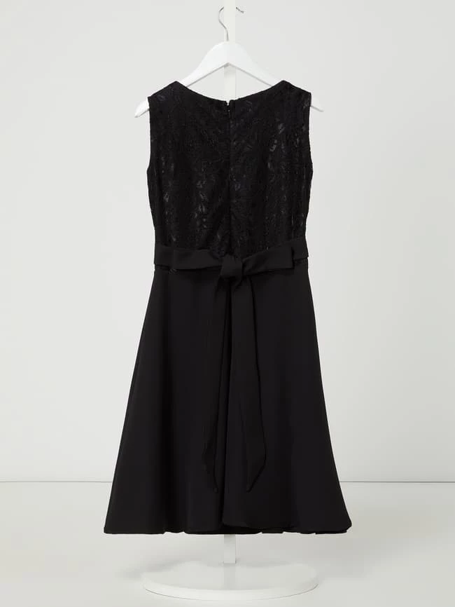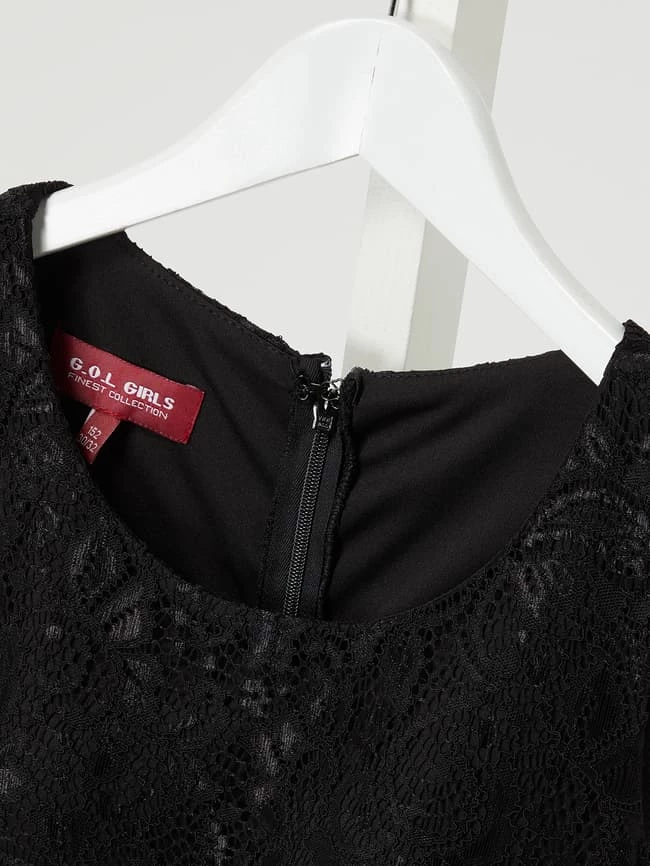 Das Kleid von G.O.L. ist aus Spitze und Krepp gefertigt. Es zeigt sich in taillierter Passform mit Rundhalsausschnitt, Taillengürtel zum Binden und ausgestelltem Rockteil.