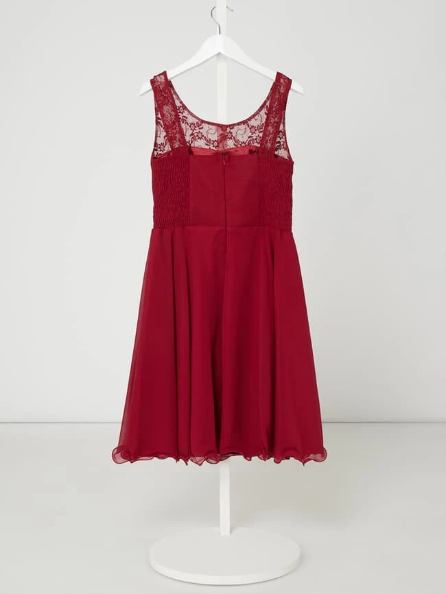 Das Kleid von G.O.L. ist aus floraler Spitze und Chiffon gefertigt. Es zeigt sich in taillierter Passform mit Ziersteinbesatz, ausgestelltem Rockteil und gesmokter Rückseite.