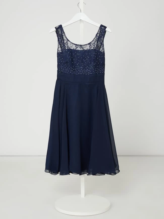 Das Kleid von G.O.L. ist aus floraler Spitze und Chiffon gefertigt. Es zeigt sich in taillierter Passform mit Ziersteinbesatz, ausgestelltem Rockteil und gesmokter Rückseite.