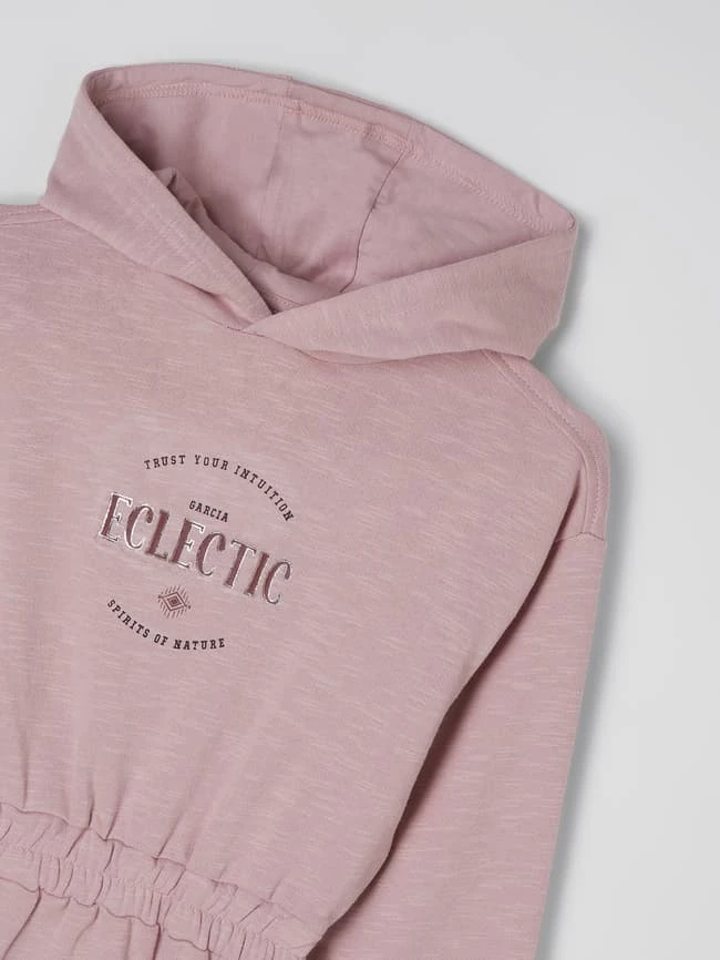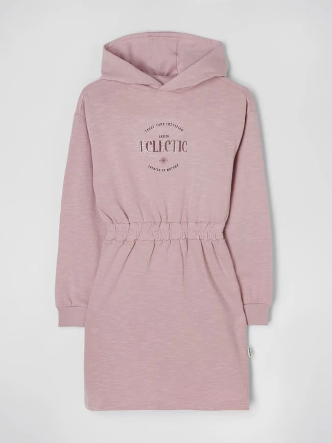 Das Sweatkleid von Garcia ist aus einer Baumwollmischung gefertigt. Es zeigt sich in taillierter Passform mit Kapuze und Message.