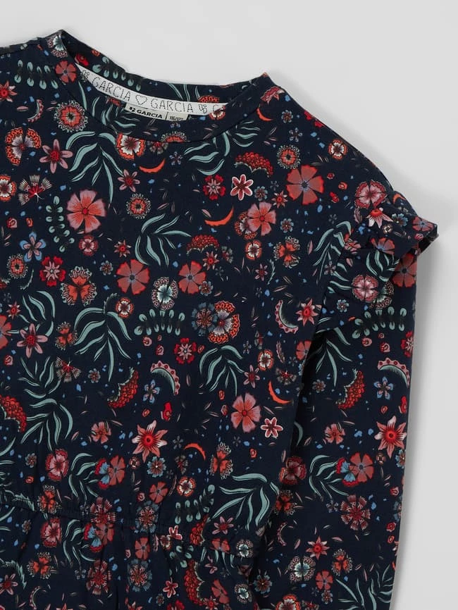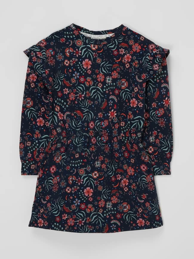 Das Sweatkleid von Garcia ist aus einem Baumwoll-Elasthan-Mix gefertigt und tailliert geschnitten. Es zeigt sich mit Ornament-Muster, Stehkragen und Rüschen.