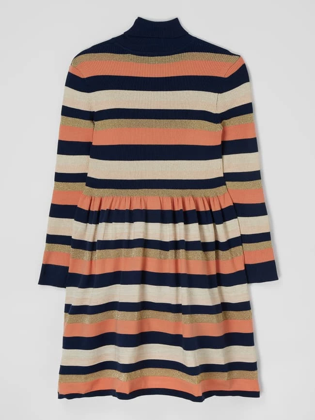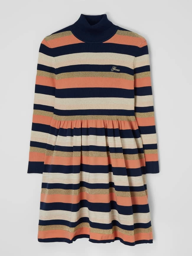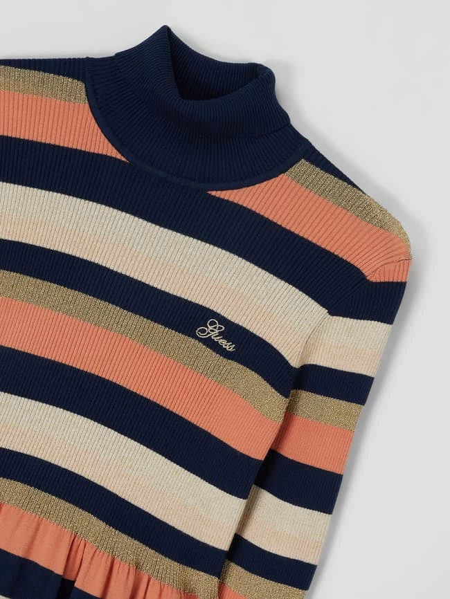 Das Kleid von GUESS ist aus einer Viskosemischung mit Effektgarn gefertigt. Es zeigt sich in lockerer Passform mit Streifenmuster, Rollkragen und Logo-Stickerei.