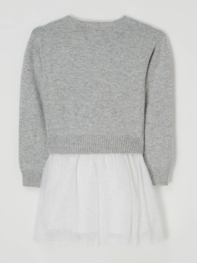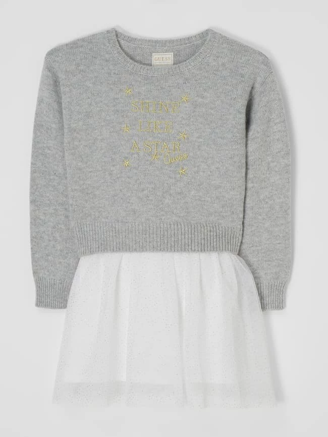 Das Kleid von GUESS ist aus einer Materialmischung mit Woll-Anteil gefertigt. Es zeigt sich in lockerer Passform mit gestricktem Oberteil, Message-Stickerei und Rockteil aus Mesh.