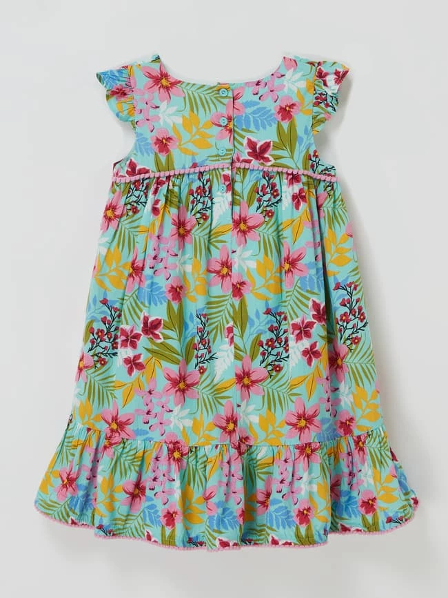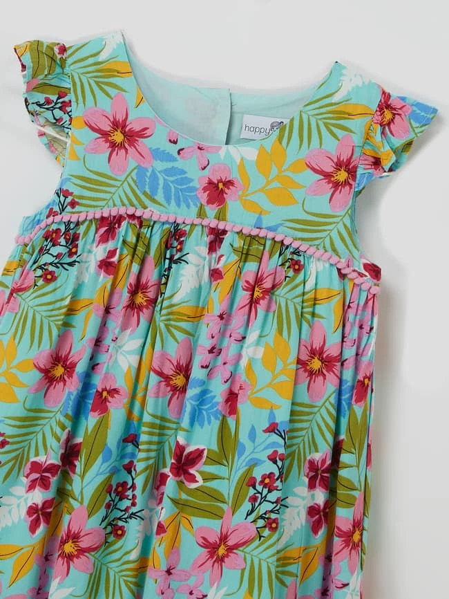 Das Kleid von happy girls ist aus reiner Viskose gefertigt und ausgestellt geschnitten. Es kommt mit floralem Muster, Volantsaum und Zierborten.