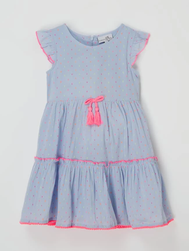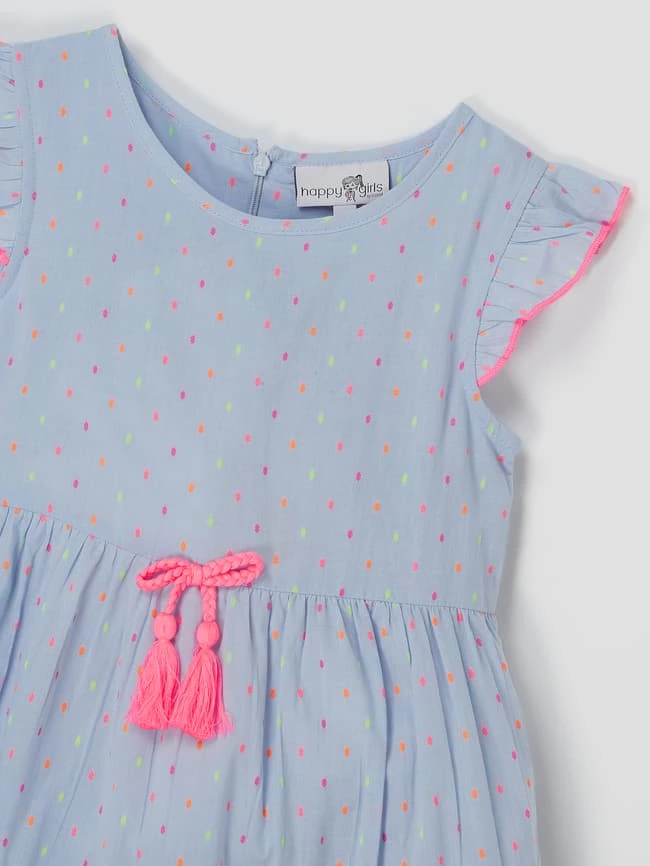 Das Kleid von happy girls ist aus einer Baumwollmischung gefertigt und ausgestellt geschnitten. Es kommt im Stufen-Look mit Allover-Muster, Rundhalsausschnitt und Zierschleife.