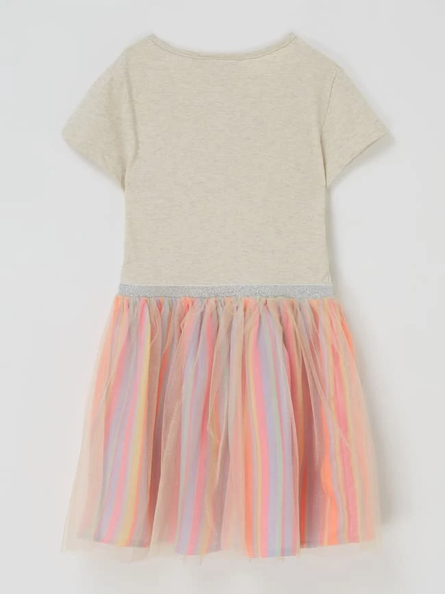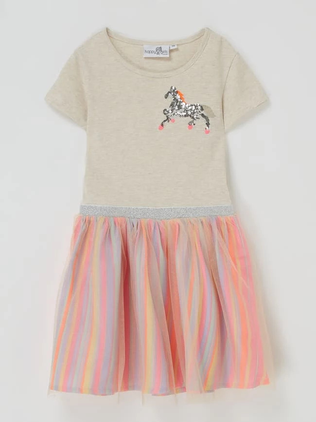 Das Kleid von happy girls ist aus einer Baumwollmischung gefertigt und ausgestellt geschnitten. Es zeigt sich mit Rundhalsausschnitt und gestreiftem Rockteil.
