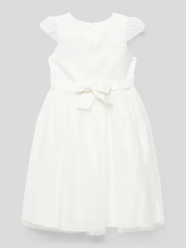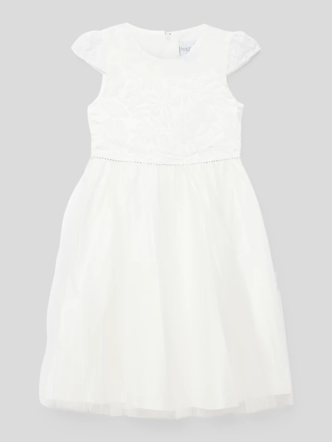 Das Kommunionskleid von happy girls ist aus einem strapazierfähigen Viskose-Mix gefertigt und ausgestellt geschnitten. Es zeigt sich in unifarbenem Design mit Zierstein- sowie Spitzenbesatz und Taillenband.