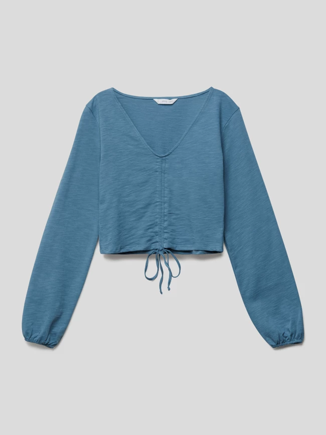 Das Cropped Longsleeve von MANGO ist aus reiner Baumwolle gefertigt und kommt in körpernaher Passform. Es zeigt sich mit V-Ausschnitt und Raffungen mit Tunnelzug sowie elastischen Ärmelabschlüssen.