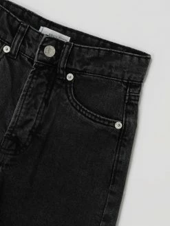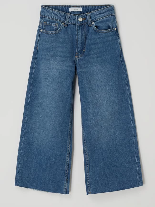Die Jeans von MANGO ist aus reiner Baumwolle gefertigt. Sie zeigt sich mit weitem Bein, ausgefransten Beinabschlüssen und Label-Patch.