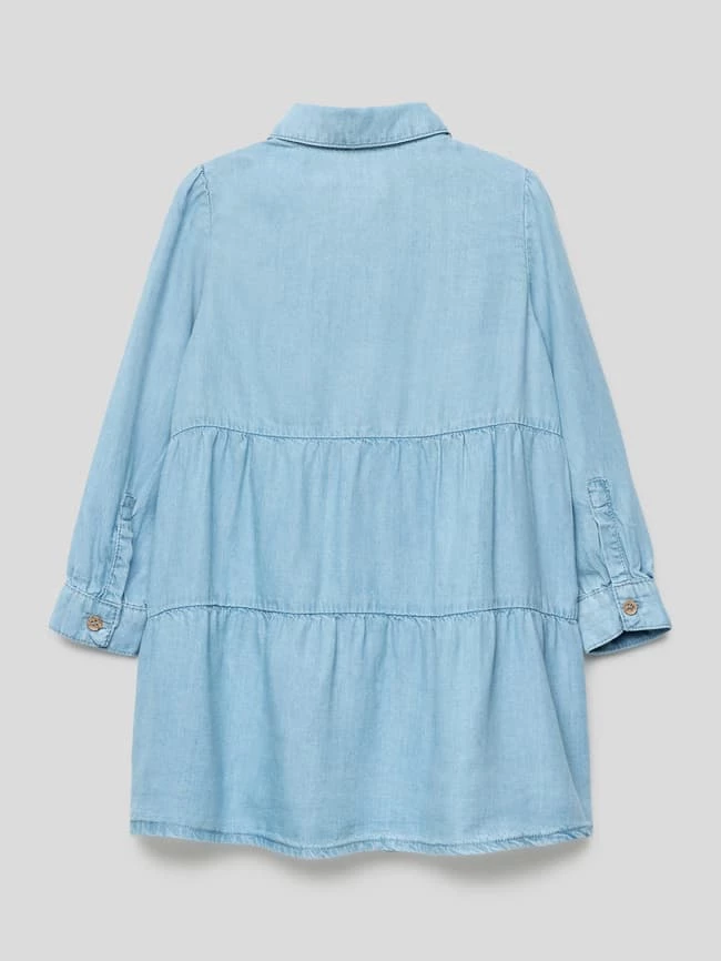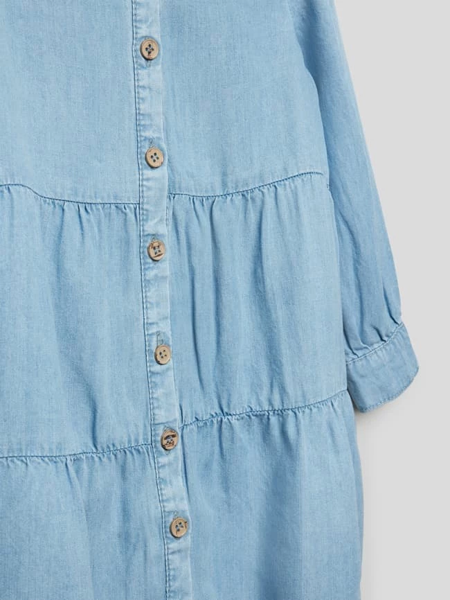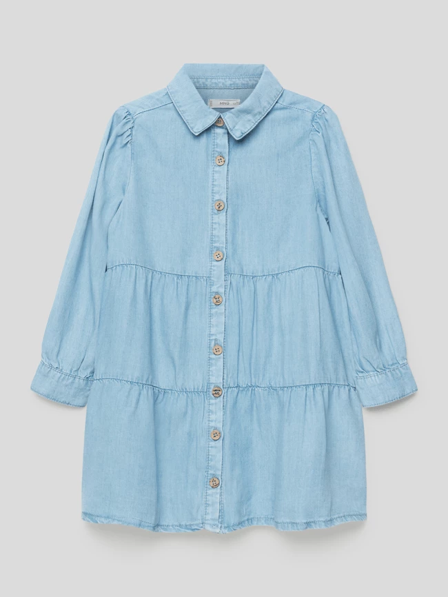 Das Jeanskleid von MANGO ist aus reinem Lyocell gefertigt und locker geschnitten. Es zeigt sich im Stufen-Look mit Umlegekragen und durchgehender Knopfleiste.