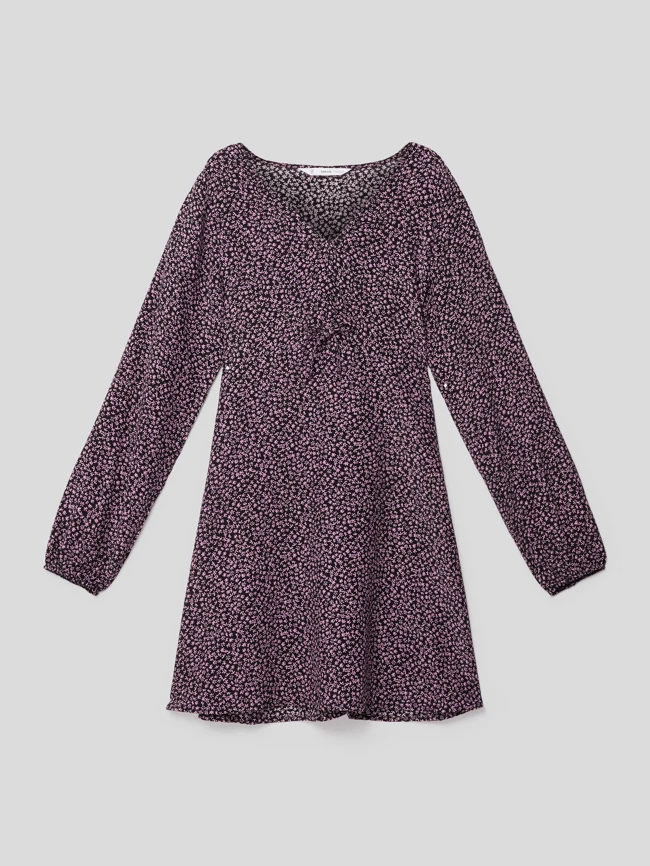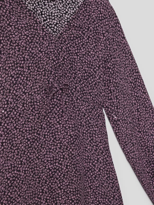 Das Kleid von MANGO ist aus reiner Viskose gefertigt und locker geschnitten. Es zeigt sich mit floralem Allover-Muster und V-Ausschnitt sowie elastischen Ärmelabschlüssen.