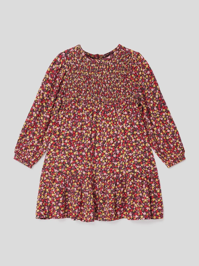 Das Kleid von MANGO ist aus reiner Viskose gefertigt und gerade geschnitten. Es zeigt sich mit floralem Allover-Muster, Smok-Details und ausgestellter Rockpartie.