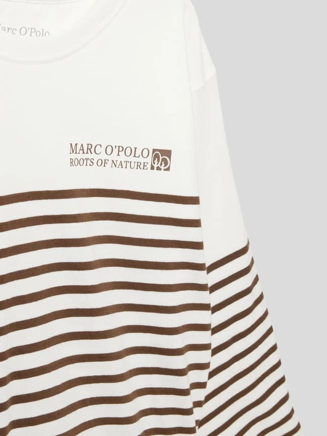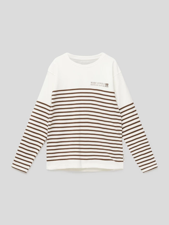 Das Longsleeve von MARC O’POLO ist aus reiner Bio-Baumwolle gefertigt und in lockerer Passform gehalten. Es zeigt sich mit Streifenmuster, Label-Print und geripptem Rundhalsausschnitt.