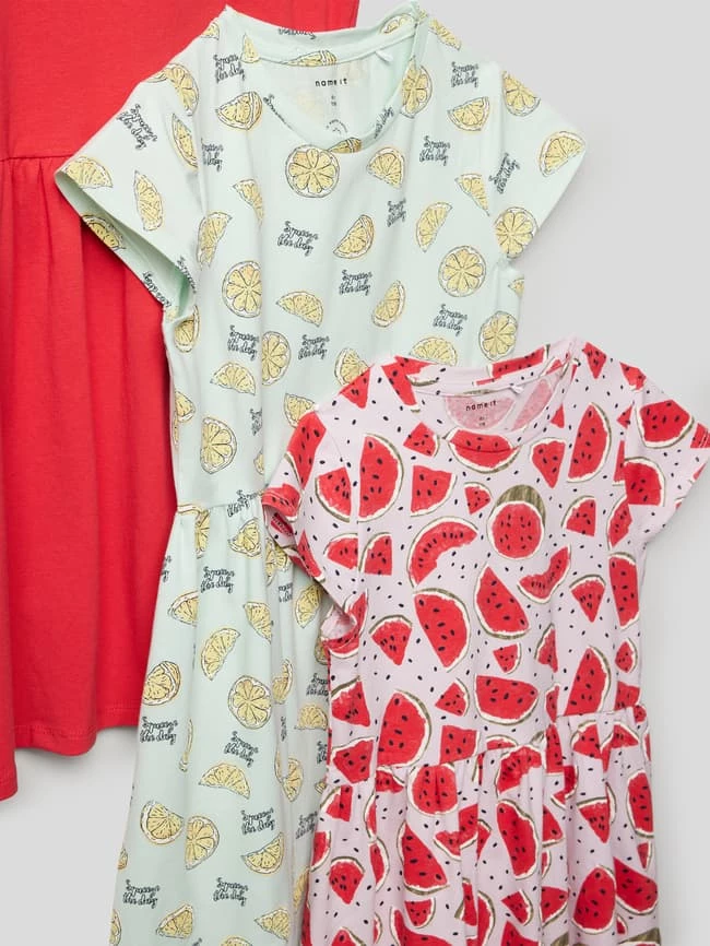 Das Kleid von NAME IT ist aus einem Baumwoll-Elasthan-Mix gefertigt und tailliert geschnitten. Es zeigt sich mit Rundhalsausschnitt, elastischem Einsatz an der Taille und angeschnittenen Ärmeln.