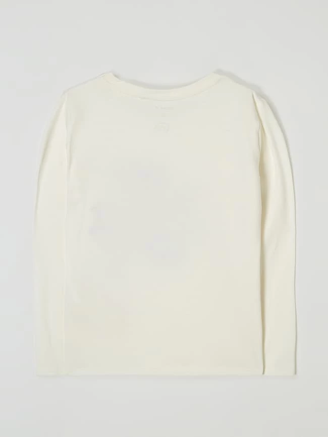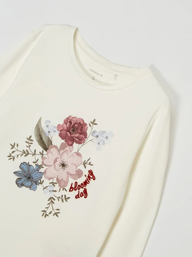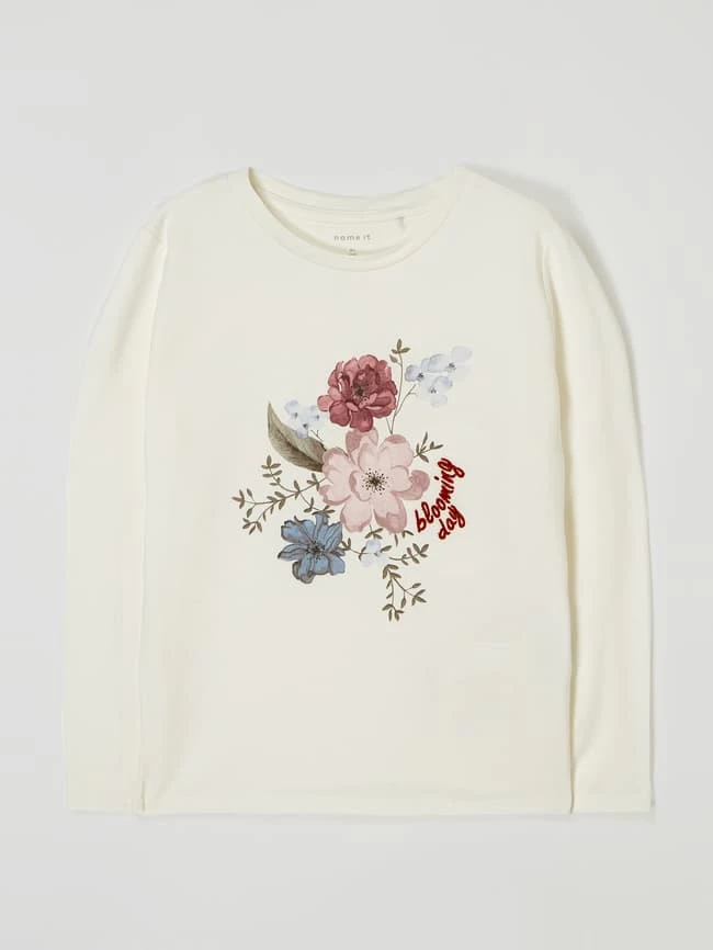 Das Longsleeve von Name It ist aus einer Baumwollmischung mit Bio-, Modal- und Stretch-Anteil gefertigt und gerade geschnitten. Es zeigt sich mit Rundhalsausschnitt, Print und Stickerei.
