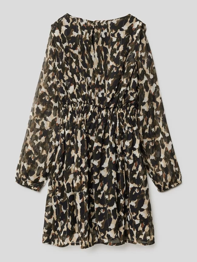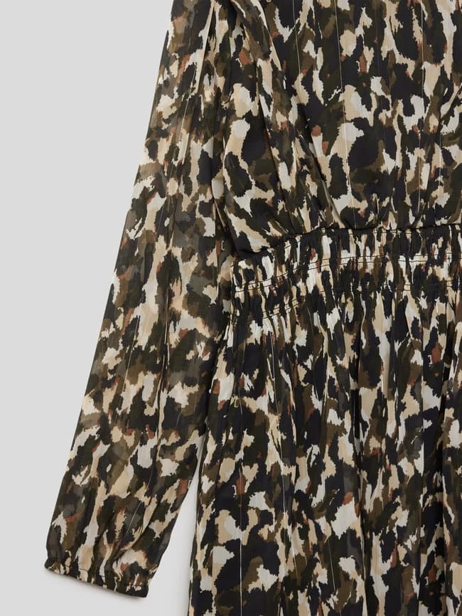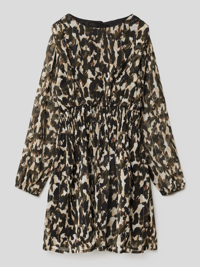 Das Kleid von ONLY ist aus einem strapazierfähigen Material gefertigt und tailliert geschnitten. Es zeigt sich mit Allover-Muster, Smok-Details, Cut Out und ausgestellter Rockpartie.