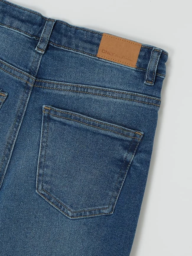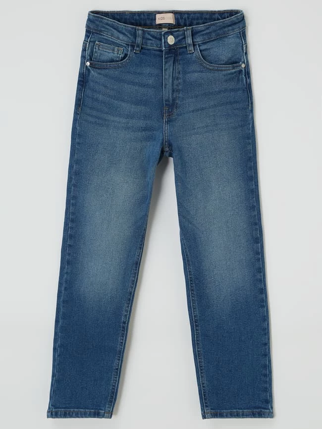 Die Jeans von KIDSONLY ist aus einem Baumwoll-Elasthan-Mix gefertigt. Sie kommt im Mom Fit mit Eingrifftaschen, Kontrastnähten und regulierbarer Bundweite.