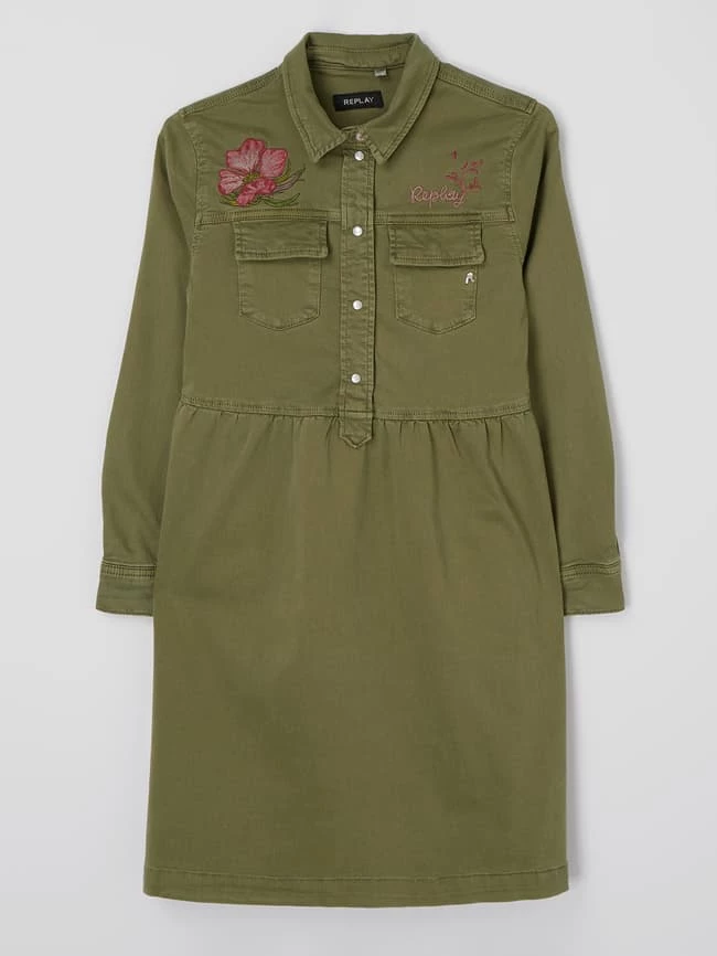 Das Kleid von Replay ist aus einem Baumwoll-Lyocell-Mix gefertigt und tailliert geschnitten. Es kommt mit Umlegekragen, Druckknopfleiste am Oberteil und Stickereien.