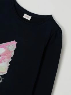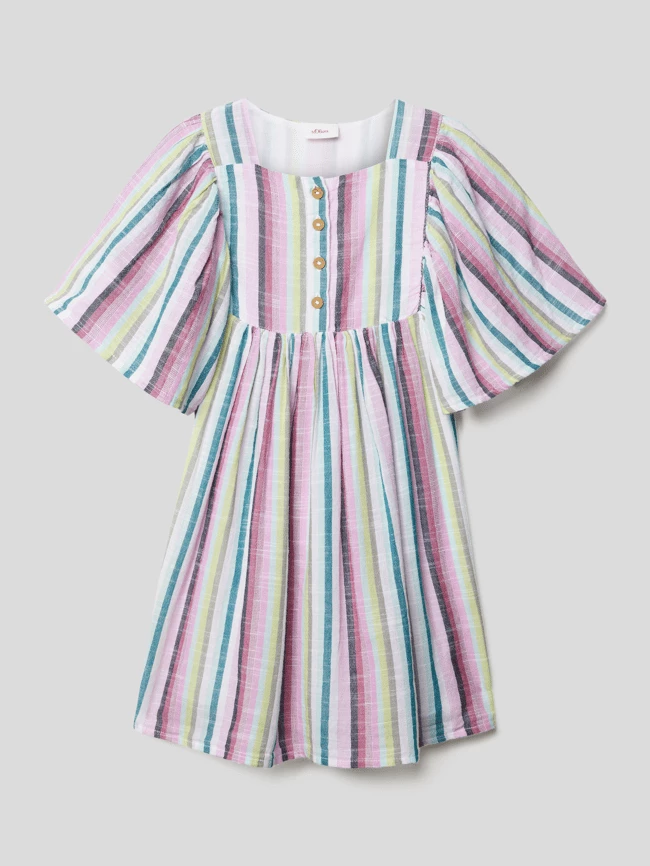 Das Kleid von s.Oliver RED LABEL ist aus reiner Baumwolle gefertigt und tailliert geschnitten. Es zeigt sich mit Volantärmeln und Streifenmuster sowie Raffungen und kurzer Knopfleiste.