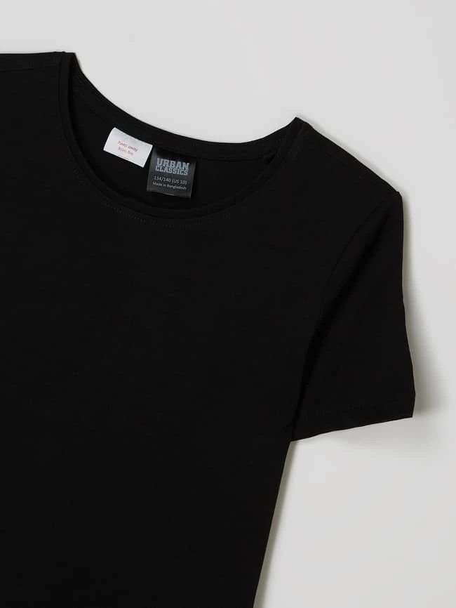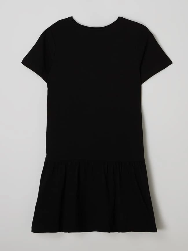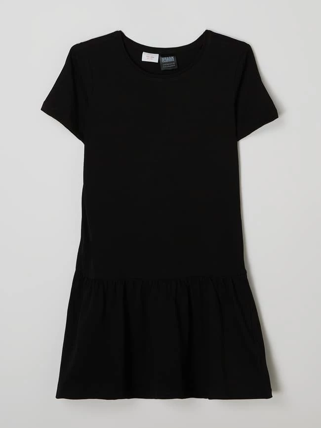 Das Shirtkleid von Urban Classics ist aus reiner Baumwolle gefertigt. Es kommt in ausgestellter Passform mit Rundhalsausschnitt, kurzen Ärmeln und Volantsaum.