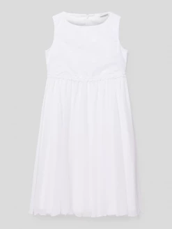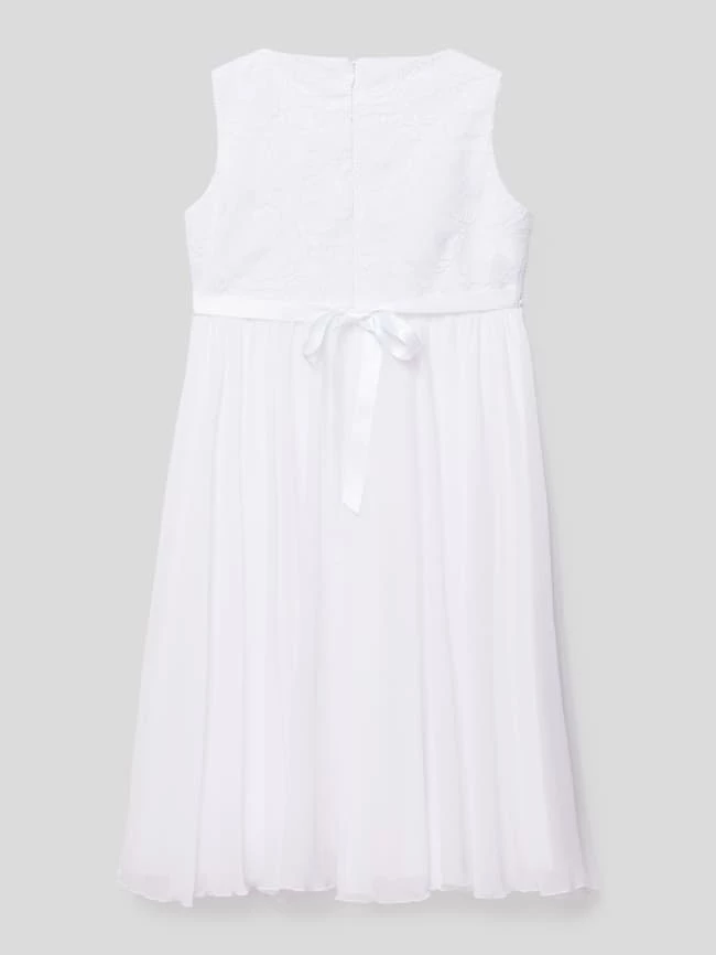 Das Kommunionskleid von Weise ist aus einem strapazierfähigen Material gefertigt und tailliert geschnitten. Es zeigt sich in unifarbenem Design mit Spitzenbesatz sowie Taillenband.